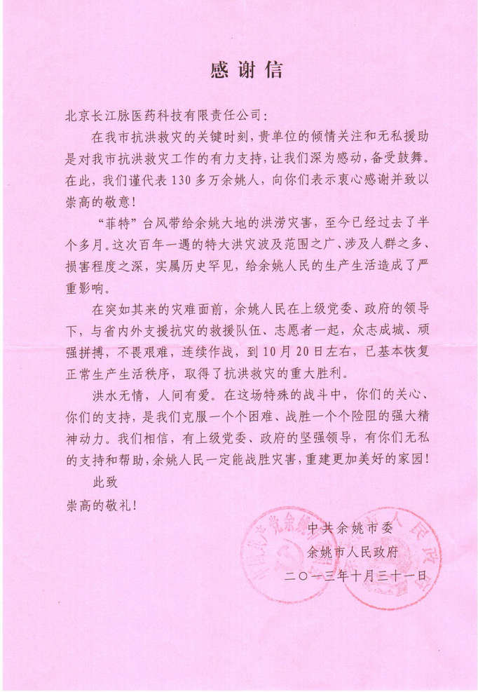 近日,我公司收到一封由余姚市人民政府發來的感謝信,信中對我公司在余姚市抗洪救災工作中的傾情關注和無私援助表示感謝。10月14日,公司向受災嚴重的浙江省余姚市救災總指揮部捐贈了一批 “健之素牌消毒片”,為保障災區民眾的健康出了一份力。
