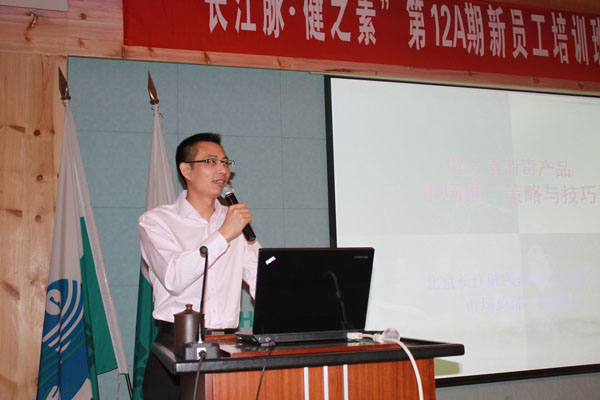 公司市場總部常務(wù)副總經(jīng)理胡早云正在講授《健之素消毒產(chǎn)品市場推廣策略與技巧》